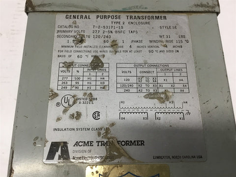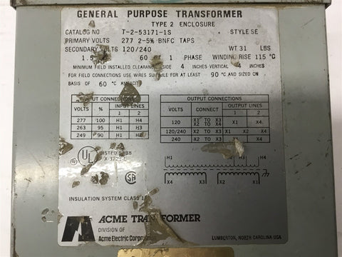 ACME T-2-53171-1S General Purpose Transformer Return Policy Returns accepted within 30 days. Items sold as is cannot be returned, unless description is in error. Buyer pays return freight. Shipping Policy We ship almost all items with 1 business day of cleared payment. We ship USPS and UPS. We can ship on your account. If you will be shipping freight, please be sure to provide all delivery contact information including a phone number. We will need to know if you have a fork lift or dock.