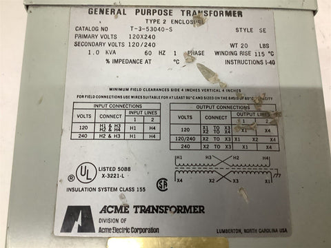 Acme T-3-53040-S 1 KVA Single Phase Transformer 120x240 Pri, 120/240 Sec Return Policy Returns accepted within 30 days. Items sold as is cannot be returned, unless description is in error. Buyer pays return freight. Shipping Policy We ship almost all items with 1 business day of cleared payment. We ship USPS and UPS. We can ship on your account. If you will be shipping freight, please be sure to provide all delivery contact information including a phone number. We will need to know if you have a fork lift or dock.