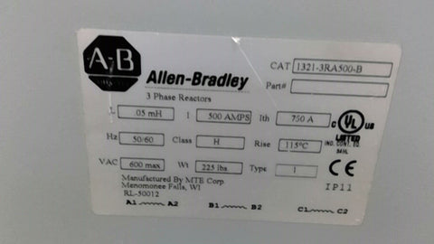 Allen Bradley 1321-3RA500-B 3 Phase Reactor 500A 600V 50/60HZ .05mH Return Policy Returns accepted within 30 days. Items sold as is cannot be returned, unless description is in error. Buyer pays return freight. Shipping Policy We ship almost all items with 1 business day of cleared payment. We ship USPS and UPS. We can ship on your account. If you will be shipping freight, please be sure to provide all delivery contact information including a phone number. We will need to know if you have a fork lift or dock.