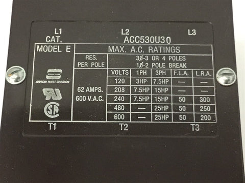 Arrow Hart ACC530U30 Model E Contactor 62 Amps 600 Vac 208-240 V coil Return Policy Returns accepted within 30 days. Items sold as is cannot be returned, unless description is in error. Buyer pays return freight. Shipping Policy We ship almost all items with 1 business day of cleared payment. We ship USPS and UPS. We can ship on your account. If you will be shipping freight, please be sure to provide all delivery contact information including a phone number. We will need to know if you have a fork lift or dock.