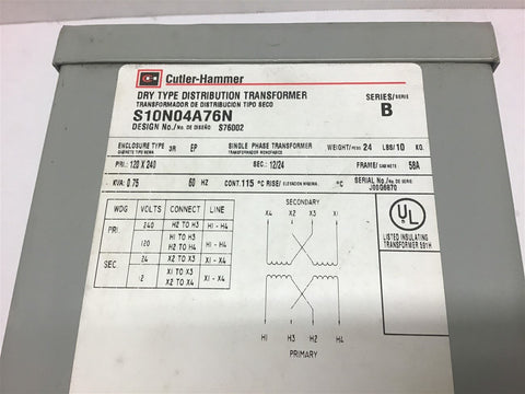 Cutler-Hammer S10N04A76N 0.75 KVA Transformer 240 120 Pri 24 12 Sec Volts 1 Phas