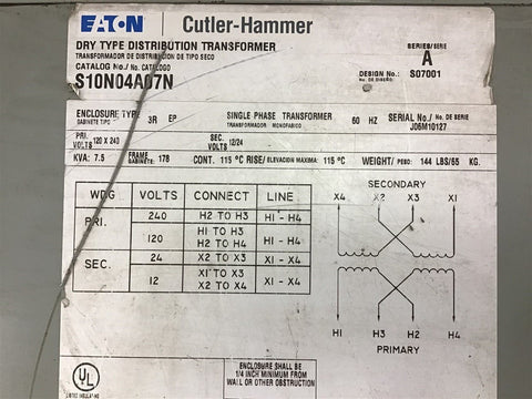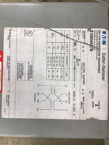 Eaton S10NO4A07N 7.5 KVA Transformer Single Phase 120 x 240 Pri 12/24 Sec Volts Return Policy Returns accepted within 30 days. Items sold as is cannot be returned, unless description is in error. Buyer pays return freight. Shipping Policy We ship almost all items with 1 business day of cleared payment. We ship USPS and UPS. We can ship on your account. If you will be shipping freight, please be sure to provide all delivery contact information including a phone number. We will need to know if you have a fork lift or dock.