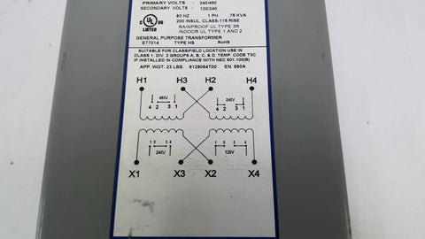 Emerson HS1F750B .75KVA Transformer 240/480V Pri 120/240V Sec Single Phase 3R
