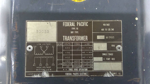 Federal Pacific 50033 Transformer 3 KVA 400-120/240 V Return Policy Returns accepted within 30 days. Items sold as is cannot be returned, unless description is in error. Buyer pays return freight. Shipping Policy We ship almost all items with 1 business day of cleared payment. We ship USPS and UPS. We can ship on your account. If you will be shipping freight, please be sure to provide all delivery contact information including a phone number. We will need to know if you have a fork lift or dock.