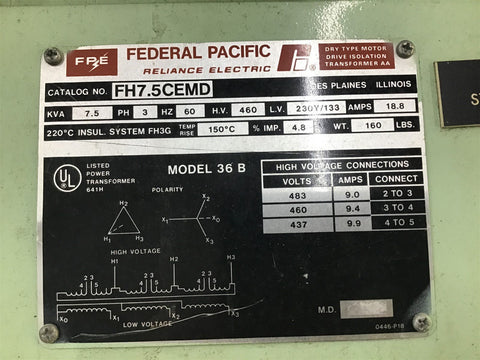 Federal Pacific FH7 5CEMD Transformer 7.5KVA 3PH 60HZ 460HV 230Y/133 18.8Amps Return Policy Returns accepted within 30 days. Items sold as is cannot be returned, unless description is in error. Buyer pays return freight. Shipping Policy We ship almost all items with 1 business day of cleared payment. We ship USPS and UPS. We can ship on your account. If you will be shipping freight, please be sure to provide all delivery contact information including a phone number. We will need to know if you have a fork lift or dock.