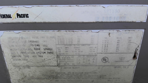 Federal Pacific S21100 100 KVA Transformer 240/480V Pri 120/240 Sec Single Phase