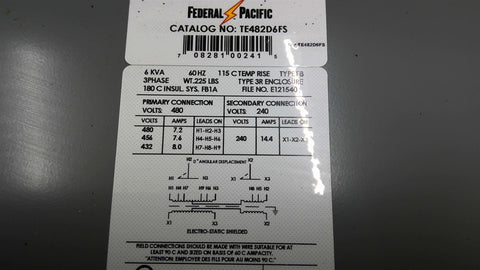 Federal Pacific TE482D6FS 6 KVA Transformer 480 Pri V 240 Sec V 3 PH