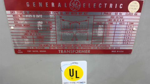 GE 9T23B2672 57.5 KVA Transformer 217-516 Pri V 120/240 Sec V Single PH