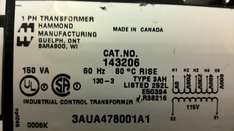 Hammond 143206 Single Phase 60HZ Transformer 150 Va Return Policy Returns accepted within 30 days. Items sold as is cannot be returned, unless description is in error. Buyer pays return freight. Shipping Policy We ship almost all items with 1 business day of cleared payment. We ship USPS and UPS. We can ship on your account. If you will be shipping freight, please be sure to provide all delivery contact information including a phone number. We will need to know if you have a fork lift or dock.