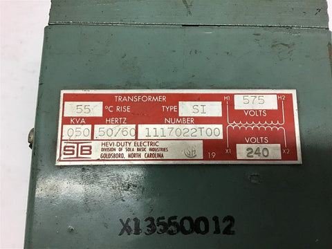 Hevi-Duty 1117022T00 .50 KVA Transformer 575 Pri Volts 240 Volts Sec Return Policy Returns accepted within 30 days. Items sold as is cannot be returned, unless description is in error. Buyer pays return freight. Shipping Policy We ship almost all items with 1 business day of cleared payment. We ship USPS and UPS. We can ship on your account. If you will be shipping freight, please be sure to provide all delivery contact information including a phone number. We will need to know if you have a fork lift or dock.