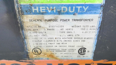 Hevi-Duty DT651H220S 220kVa Transformer PRI 480v SEC 460/266v 3ph