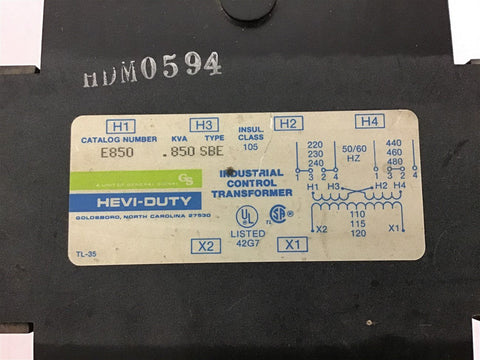 Hevi-Duty E850 .850 KVA Control Transformer 240 480 Pri 110 115 120 Sec Return Policy Returns accepted within 30 days. Items sold as is cannot be returned, unless description is in error. Buyer pays return freight. Shipping Policy We ship almost all items with 1 business day of cleared payment. We ship USPS and UPS. We can ship on your account. If you will be shipping freight, please be sure to provide all delivery contact information including a phone number. We will need to know if you have a fork lift or dock.