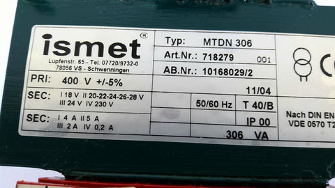 Ismet MTDN 306 Transformer 306 VA 400 Pri 230 Sec Volts Return Policy Returns accepted within 30 days. Items sold as is cannot be returned, unless description is in error. Buyer pays return freight. Shipping Policy We ship almost all items with 1 business day of cleared payment. We ship USPS and UPS. We can ship on your account. If you will be shipping freight, please be sure to provide all delivery contact information including a phone number. We will need to know if you have a fork lift or dock.