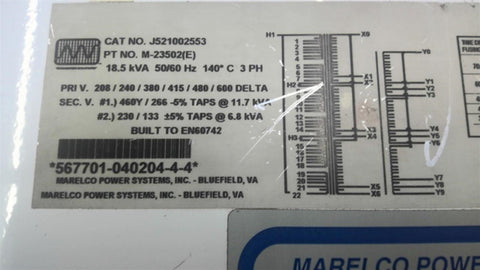 Marelco M-23502 J521002553 Transformer 18.5 Kva 208/240/480/600 Pri 230/460 Sec Return Policy Returns accepted within 30 days. Items sold as is cannot be returned, unless description is in error. Buyer pays return freight. Shipping Policy We ship almost all items with 1 business day of cleared payment. We ship USPS and UPS. We can ship on your account. If you will be shipping freight, please be sure to provide all delivery contact information including a phone number. We will need to know if you have a fork lift or dock.