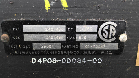 Milwaukee C1-72047 5.0 Kva Transformer 240/480 Pri/Sec Volts