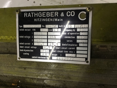 Rathgeber & CO EE8/1CNA 8 KVA Control Transformer 504 480 456 Pri 380 Sec Return Policy Returns accepted within 30 days. Items sold as is cannot be returned, unless description is in error. Buyer pays return freight. Shipping Policy We ship almost all items with 1 business day of cleared payment. We ship USPS and UPS. We can ship on your account. If you will be shipping freight, please be sure to provide all delivery contact information including a phone number. We will need to know if you have a fork lift or dock.
