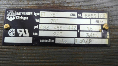 Rathgeber ET 750 Transformer 750VA 488-465-4420 Pri 220 sec Volts