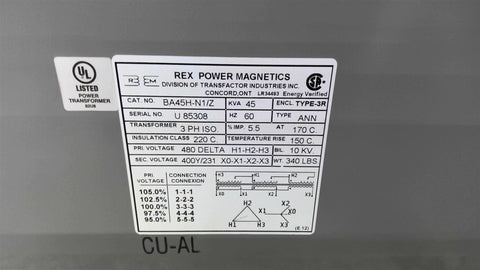 Rex Power Magnetics BA45H-N1/Z 45kVa Transformer PRI 480V Delta SEC 400Y 3 Phase