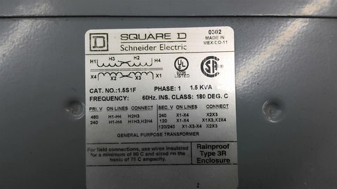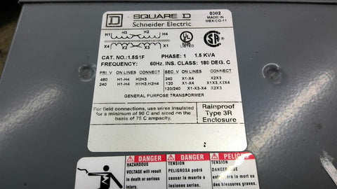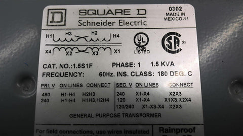 Square D 1.5S1F 1.5Kva Transformer 240/480 Pri 120/240 Sec Volts Single Phase Return Policy Returns accepted within 30 days. Items sold as is cannot be returned, unless description is in error. Buyer pays return freight. Shipping Policy We ship almost all items with 1 business day of cleared payment. We ship USPS and UPS. We can ship on your account. If you will be shipping freight, please be sure to provide all delivery contact information including a phone number. We will need to know if you have a fork lift or dock.