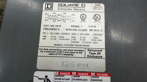 Square D 3S1F 3 KVA Transformer 480/240 Pri V 120/240 Sec V Single Phase