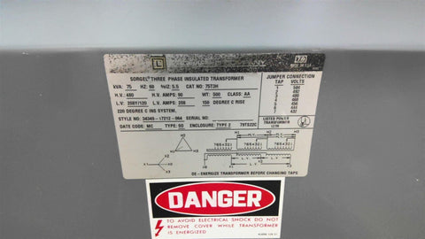 Square D 75T3H 75 KVA Insulated Transformer 480 Pri V 208/120 SEC V 3 PH