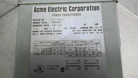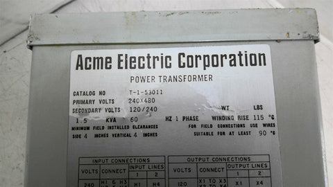 Acme Electric T-1-53011 Transformer 1.5kVA 240x480 Pri 120/240 Sec Single Phase