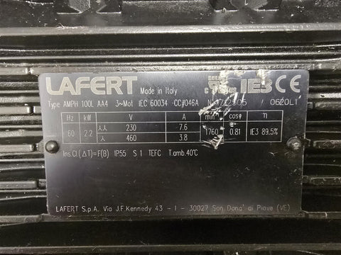 Lafert AMPH100LAA4 2.2kW AC Motor 1800RPM 4P 3PH 100L 230/460V TEFC 60Hz