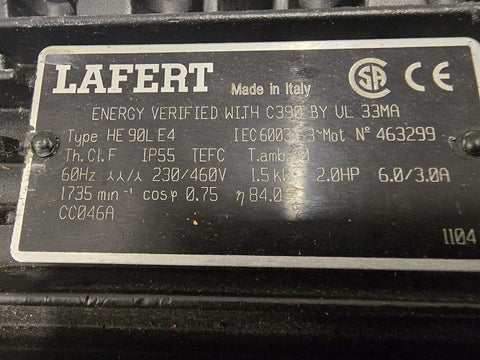 Lafert HE90LE4 2HP AC Motor 1800RPM 4P 3PH 90L 230/460V TEFC 60Hz [[Description]]BV 166154---SS284-W-1-2-3-A---50.00
