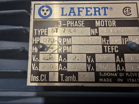 Lafert ST71L4 .070HP AC Motor 1800RPM 4P 3PH 71L 230/460V TEFC 60HZ [[Description]]BV 165086---SS283-W-2-3-3-A---25.00