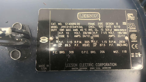 Leeson G140696.00 10 HP AC Motor 3600 RPM 2P 3 Phase 215TC 230/460 V TEFC 60 HZ
