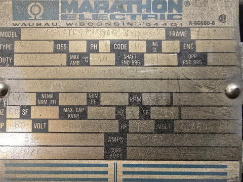 Marathon 2N404TTFS7253ANW 60HP AC Motor 1800RPM 4P 3PH 404T 460V TEFC 60HZ