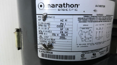 Marathon K259 1HP AC MOTOR 1800RPM 4P 3PH 56C 208-230/460V 60HZ [[Description]]CC 158099---SS283 R1-9-1-2-A---25.00