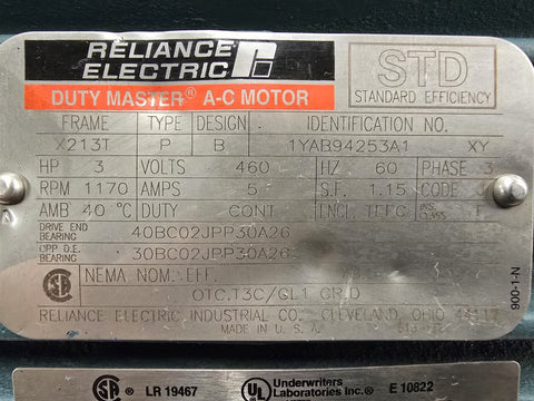 Reliance 1YAB94253A1 3HP AC Motor 1200RPM 6P 3PH X213T 460V TEFC 60Hz [[Description]]BV 165063---SS283-W-6-4-2-B---151.00