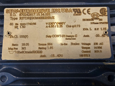 Sew Eurodrive R37DRE90M4BE2HR/Z 1.5HP Brake Gear Motor 230/460V 18.05:1 Ratio