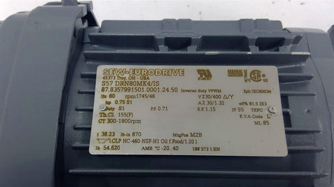 SEW S57 DRN80MK4/IS Gearmotor 3/4 HP 230/400 Volts 38.23 Ratio [[Description]]CC 163539---SS302-R1-8-1-3-B---61.00