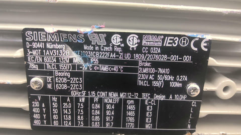 Siemens 1AV3132B 8.6 KW AC Brake Motor 460 Volts 1800 RPM [[Description]]CC 165323---SS234--R1-1-3-1-B---280.00