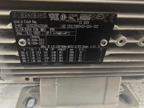 Siemens 1LE10231BA222AA4 4.55kW AC Motor 3600RPM 2P 3PH 460V 60Hz [[Description]]BV 166487---SS284-W-1-3-4-A---81.00