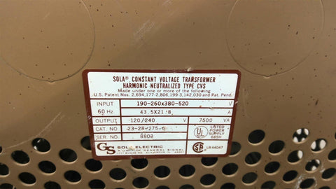 Sola 23-28-275-6 7500 VA Transformer 190-260X380-520 Input V 120/240 Output V