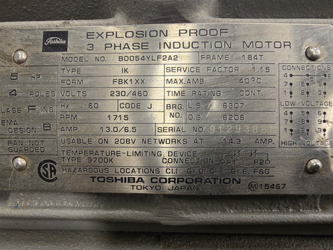 Toshiba B0054YLF2A2 5HP AC Motor 1800RPM 4P 3Ph 184T 230/460V TEFC 60Hz