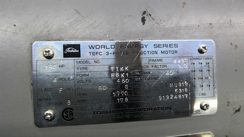 Toshiba TIKK FBK1 150 HP AC Motor 1800 RPM 4P 3 Phase 445T 460 V TEFC 60 HZ