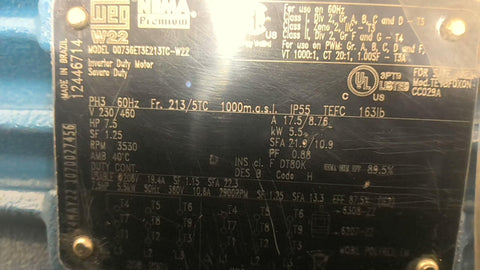 Weg 00736ET3E213TC-W22 7.5 HP AC Motor 3600 RPM 2P 3 Phase 213/5TC 208-230/460 V