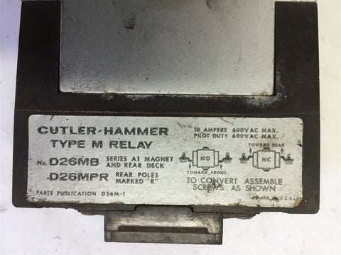 CUTLER-HAMMER TYPE M RELAY D26MB 10 AMP 600 VACUSED---GOOD VISUAL CONDITION---3/19/JC061833---SSTK---B-5-1-6-A----4.00