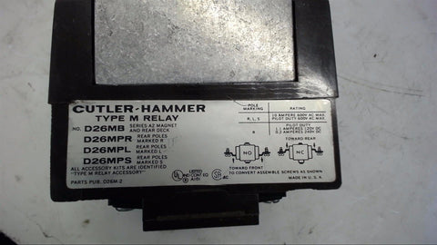 CUTLER HAMMERTYPE M RELAY D26MB 120 VOLT COIL Return Policy Returns accepted within 30 days. Items sold as is cannot be returned, unless description is in error. Buyer pays return freight. Shipping Policy We ship almost all items with 1 business day of cleared payment. We ship USPS and UPS. We can ship on your account. If you will be shipping freight, please be sure to provide all delivery contact information including a phone number. We will need to know if you have a fork lift or dock.