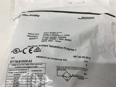 Allen Bradley 871TM-B15N30-A2 Proximity Sensor 20-250V 5-250mA Return Policy Returns accepted within 30 days. Items sold as is cannot be returned, unless description is in error. Buyer pays return freight. Shipping Policy We ship almost all items with 1 business day of cleared payment. We ship USPS and UPS. We can ship on your account. If you will be shipping freight, please be sure to provide all delivery contact information including a phone number. We will need to know if you have a fork lift or dock.