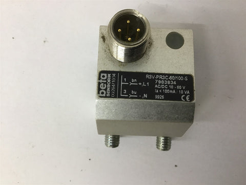 Beta R3V-PR3C-60/100-S Sensor Return Policy Returns accepted within 30 days. Items sold as is cannot be returned, unless description is in error. Buyer pays return freight. Shipping Policy We ship almost all items with 1 business day of cleared payment. We ship USPS and UPS. We can ship on your account. If you will be shipping freight, please be sure to provide all delivery contact information including a phone number. We will need to know if you have a fork lift or dock.