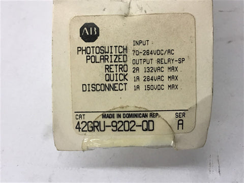 Allen-Bradley 42GRU-9202-QD Photoswitch 70-264 Vdc Return Policy Returns accepted within 30 days. Items sold as is cannot be returned, unless description is in error. Buyer pays return freight. Shipping Policy We ship almost all items with 1 business day of cleared payment. We ship USPS and UPS. We can ship on your account. If you will be shipping freight, please be sure to provide all delivery contact information including a phone number. We will need to know if you have a fork lift or dock.