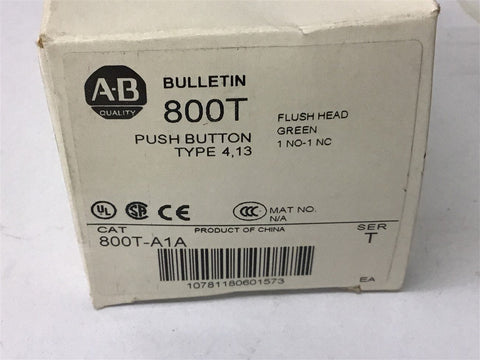 Allen-Bradley 800T-A1A Flush Head Green Pushbutton Return Policy Returns accepted within 30 days. Items sold as is cannot be returned, unless description is in error. Buyer pays return freight. Shipping Policy We ship almost all items with 1 business day of cleared payment. We ship USPS and UPS. We can ship on your account. If you will be shipping freight, please be sure to provide all delivery contact information including a phone number. We will need to know if you have a fork lift or dock.