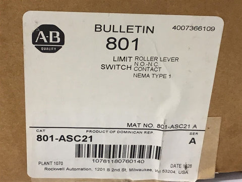 Allen-Bradley 801-ASC21 Limit Switch Roller lever Return Policy Returns accepted within 30 days. Items sold as is cannot be returned, unless description is in error. Buyer pays return freight. Shipping Policy We ship almost all items with 1 business day of cleared payment. We ship USPS and UPS. We can ship on your account. If you will be shipping freight, please be sure to provide all delivery contact information including a phone number. We will need to know if you have a fork lift or dock.