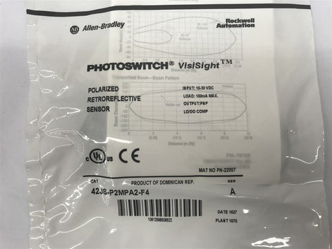 Allen-Bradley Photoswitch VisiSight 42JS-P2MPA2-F4 Size A 10-30 VDC Return Policy Returns accepted within 30 days. Items sold as is cannot be returned, unless description is in error. Buyer pays return freight. Shipping Policy We ship almost all items with 1 business day of cleared payment. We ship USPS and UPS. We can ship on your account. If you will be shipping freight, please be sure to provide all delivery contact information including a phone number. We will need to know if you have a fork lift or dock.