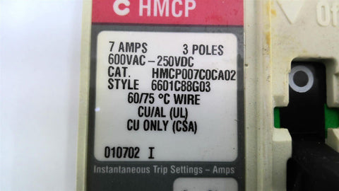 Cutler-Hammer HMCP007C0CA02 7amp 3 Poles Circuit Breaker 600 Vac
